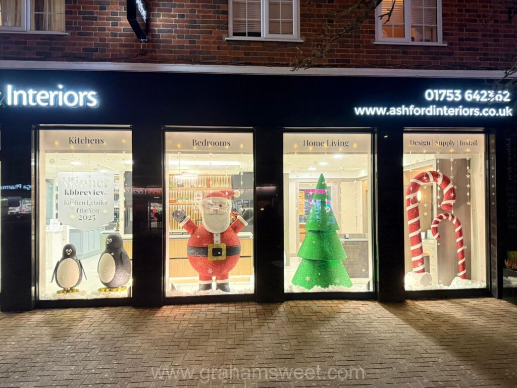 “We have installed Graham Sweets incredible Xmas props for our showroom window displays for the last few years and we have been gradually adding to our collection. We love the quality and the impact the incredible design, materials and colours have. As a business that sits in the heart of our village we wanted to give our community something festive and fun to enjoy. We love passers by stopping and admiring our display and bringing their children along for a photo with our newest member – the all-important Father Christmas! The Penguins are also a firm favourite!” Grace Flower, Managing Director at Ashford Kitchens & Interiors.